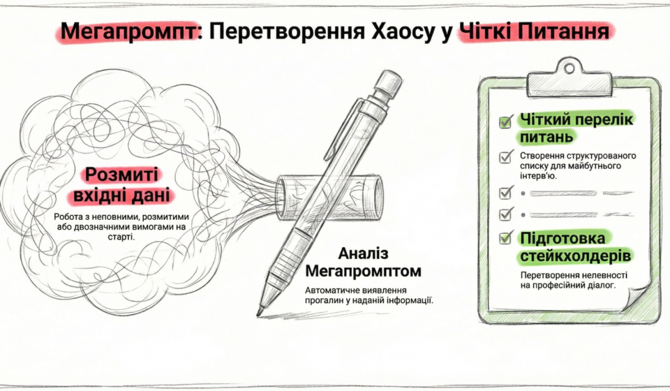 Цей мегапромпт допомагає розібратися з розмитими, неповними або двозначними вимогами та перетворити їх на чіткий набір питань для подальшого уточнення.