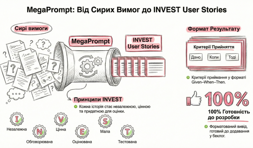 Цей промпт перетворює неструктуровані або сирі бізнес-вимоги на чіткі, форматовані User Stories, які відповідають принципам INVEST та включають Acceptance Criteria у форматі Given–When–Then.